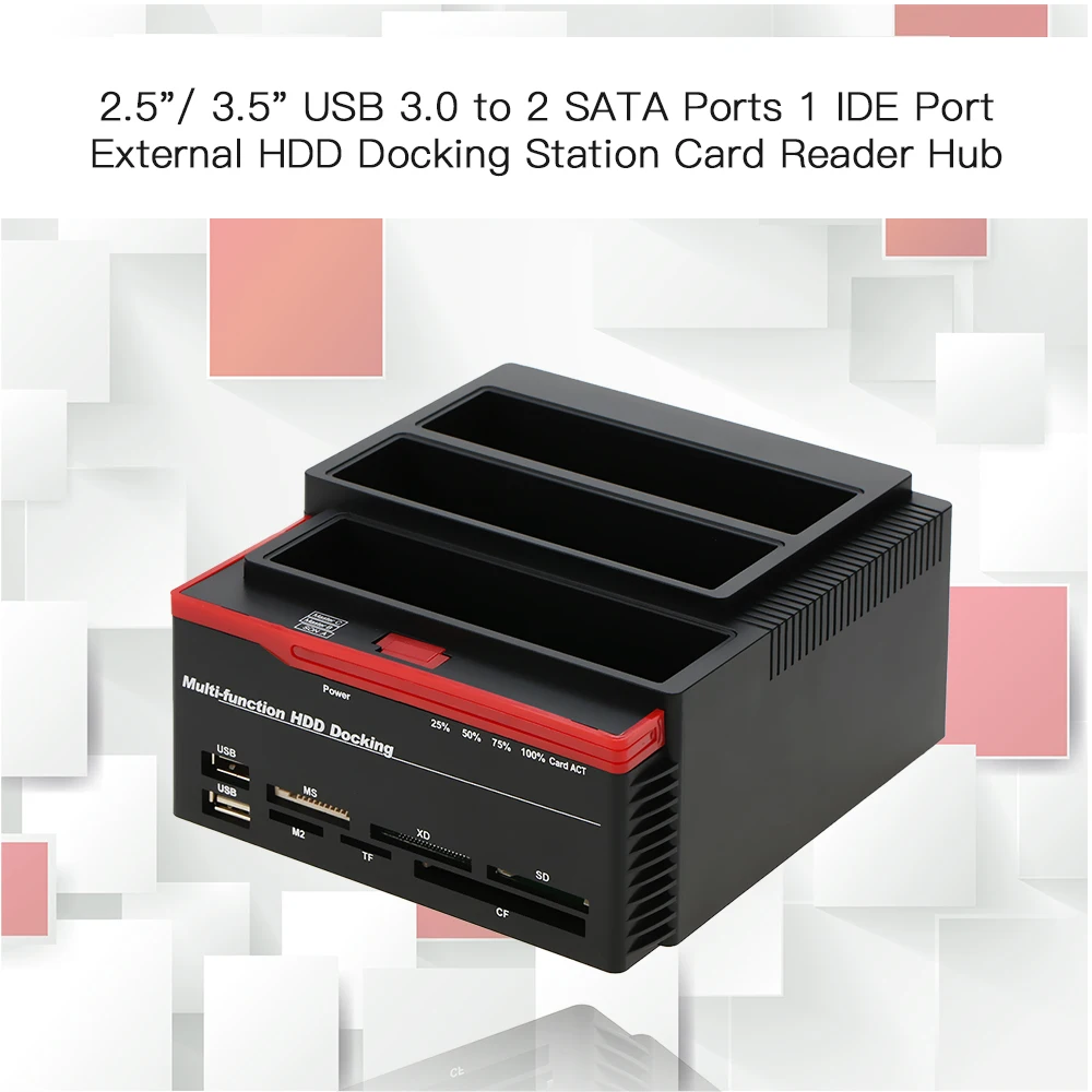 All in 1 dual bay docking station allows an easy accessing with two 2.5 inch & 3.5 inch SATA I II HDD SSD, dual 6TB hard drive with USB 3.0 hub, backward with USB 2.0/1.1. High speed USB 3.0 interface with data transfer rate up to 5Gbps, 10 times faster than USB 2.0. It supports hard disk clone, high speed one to one source HDD to target HDD without computer connections. Tool free installation, no driver needed, plug and play, support hot plug. It features 5 slots for multiple memory cards, up to 32G cards supported, easy and quick access to multimedia files. LED indicator shows the read and write status of hard disk and power supply, clear and convenient.