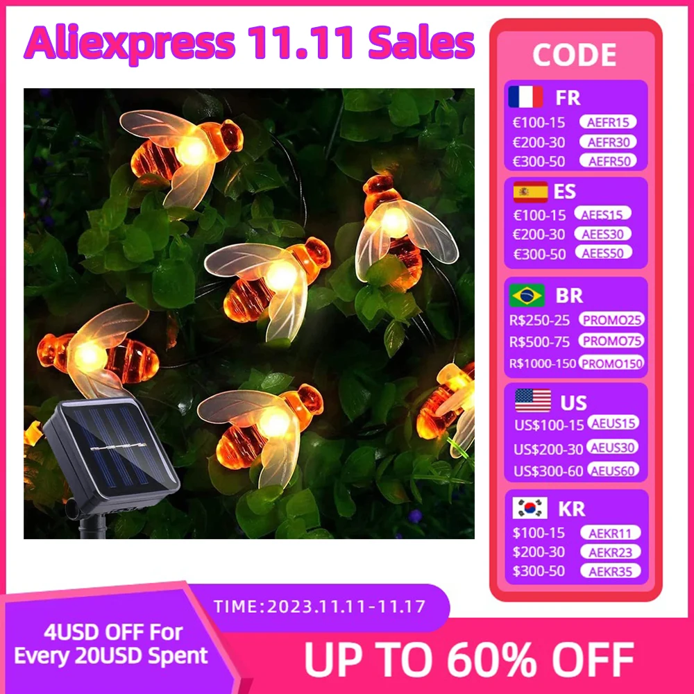 Solar String Light 20 LED Cute Bee Outdoor Light Wedding Home Garden Patio Party Christmas Tree Honeybee Starry Fairy Decor Lamp